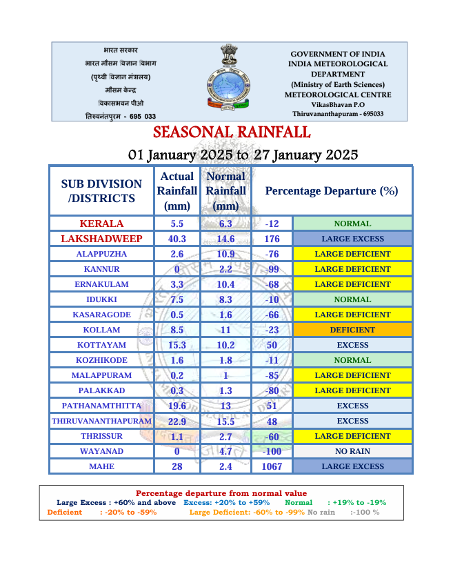 ജനുവരി ഒന്നു മുതൽ ജനുവരി 25 വരെ കേരളത്തിൻ്റെ ശരാശരി മഴ യെക്കാൾ 12% കുറവാണ് കിട്ടിയത്,ലഭിക്കേണ്ടി ഇരുന്നത് 6.3 mm, കിട്ടിയത് 5.5 mm.വടക്കൻ ജില്ലകളിൽ മഴക്കുറവ് കൂടുതലാണ്. കാസർഗോഡ് 66% കുറഞ്ഞായിരുന്നു മഴ.കണ്ണൂരിൽ യഥാർത്ഥ മഴ യുടെ 1% മാത്രം ലഭിച്ചു.കോഴിക്കോട് 11% കുറച്ചായിരുന്നു മഴ. മലപ്പുറത്ത് -85%വും പാലക്കാട് -80%,കൊല്ലം -23%,ആലപ്പുഴ -76%, ഇടുക്കിയിൽ-10% എന്നിങ്ങനെയാണ് മഴക്കുറവ്.വയനാട്ടിൽ ഒട്ടും മഴ ലഭിച്ചില്ല.തിരുവനന്തപുരം ജില്ലക്കു മാത്രമാണ് അധികം മഴ കിട്ടിയത്, 48% അധികമായിരുന്നു മഴ.