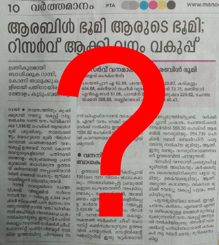 റാന്നി വന മേഖലയിലെ 1536.82 ഹെക്ടര് ആരബൽ ഭൂമി (കൃഷിക്കും താമസ ത്തിനും മാത്രമായി റവന്യൂ വകുപ്പ് കൈമാറിയ വന ഭൂമി) പെട്ടെന്ന് റിസര്വ്വ് വന ഭൂമിയാക്കി മാറ്റി എന്നാണ് പ്രമുഖ പത്രങ്ങളുടെ റിപ്പോര്ട്ടിംഗ്.1970 ല് റവന്യൂ വകുപ്പ് ഏറ്റെടുത്ത വനം, അയ്യപ്പന് കോവില്(ഇടുക്കി ഡാം)പ്രദേശത്തു നിന്നും കുടി ഇറക്കപെട്ട 500 കുടുംബങ്ങള്ക്ക് കൃഷി ചെയ്തു ജീവിക്കുവാന് നല്കുകയുണ്ടായി. ആരബൽ ഭൂമിയിൽ വളരുന്ന(ചുരുക്കം വിഭാഗത്തിൽ പെട്ട )വന്യ മരങ്ങളെ മുറിച്ചു മാറ്റുന്നതില് നിയന്ത്രണങ്ങളുണ്ട്.പടയണി പാറ, മണിയാര്,പാമ്പിനി,തണ്ണിതോട്, പമ്പാവാലി എന്നിവിടങ്ങളില് വ്യാപിച്ചു കിടക്കുന്നതാണ് മുകളിൽ പറഞ്ഞ ആരബല് ഭൂമി.