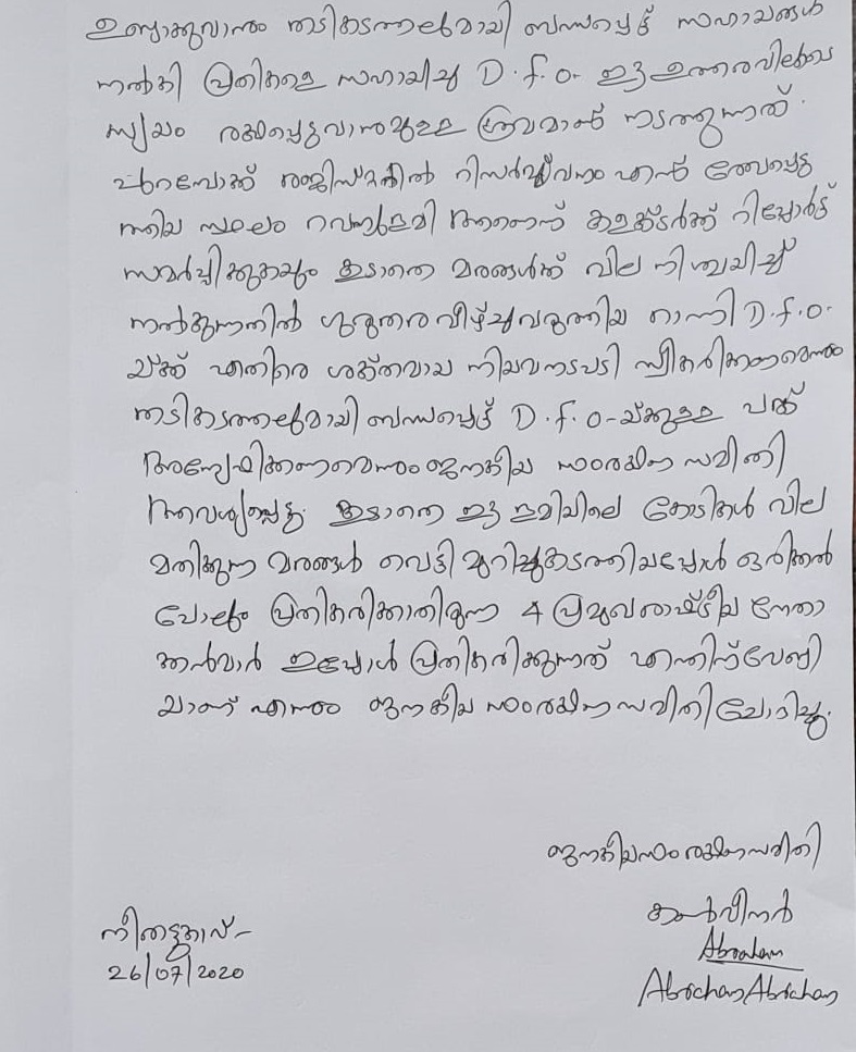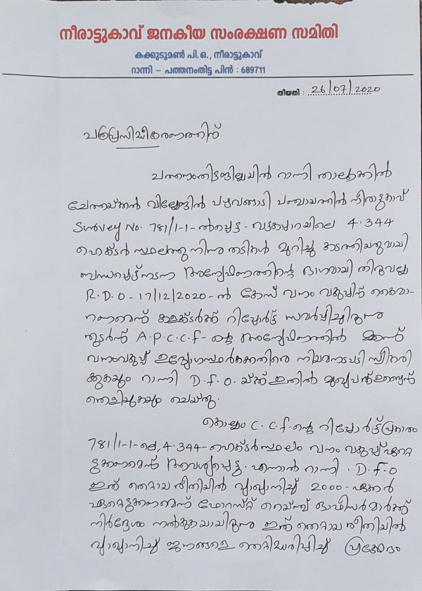 സര്ക്കാര് വന ഭൂമിയില് നിന്ന് മരം മുറിച്ചു കടത്തിയ ശേഷം, ഖനനത്തിന് അനുവാദം നല്കിയ റാന്നി DFO എന്ന Indian Forest Service ഉദ്യോഗസ്ഥന്റെ മാരത്തോണ് നിയമ വിരുദ്ധ പ്രവര്ത്തനം തിരിച്ചറിഞ്ഞ South Kerala Chief Conservator ഖനനം നിര്ത്തി വെക്കുവാൻ നിർദ്ദേശിച്ചു.പ്രസ്തുത 4.344 ഹെക്ടര് ഭൂമി വന ഭൂമിയായി സംരക്ഷിക്കുവാനും രേഖാ മൂലം ആവശ്യപ്പെട്ടു. പ്രസ്തുത നിര്ദ്ദേശത്തെ 3800 ഏക്കറില് താമസിക്കുന്നവരുടെ കൃഷി ഭൂമിയെ വന ഭൂമിയാക്കി മാറ്റുന്നു എന്ന തരത്തില് ചിത്രീകരിക്കുവാന് റാന്നി DFO തന്റെ അധികാരം ഉപയോഗിച്ചു എന്ന് Chief Conservator ഇറക്കിയ പത്ര കുറിപ്പ് വ്യക്തമാക്കുന്നു . വനം വകുപ്പിലെ ജില്ലാ തലത്തിലെ ഉദ്യോഗസ്ഥന് ഇത്തരത്തില് പ്രവര്ത്തിച്ചതിനു പിന്നില് രാഷ്ട്രീയ- മാധ്യമ-പിന്തുണയുണ്ട് . ഇവരുടെ രോദനങ്ങളെല്ലാം ഖനന രംഗത്തു കുപ്രസിദ്ധി നേടിയവര്ക്ക് വേണ്ടിയാണ് എന്ന് കേരളീയര് തിരിച്ചറിയണം.