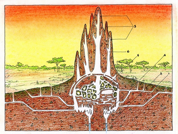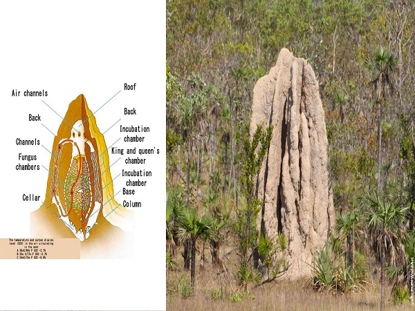 പരിസ്ഥിതിയുമായി ഏറെ അടുത്തു നില്ക്കുന്ന വീട് നിര്മ്മാണം മനസ്സിലാക്കുവാന് ചിതല് പുറ്റുകളെ പരിശോധിച്ചാല് മതിയാകും. ലോകത്തെ ഏറ്റവും ഉയരമുള്ള വീടുകള് സ്വയം നിര്മ്മിച്ച് താമസിക്കുന്ന ജീവികളാണ് ചിതലുകൾ.(ജീവിയുടെ വലിപ്പവുമായി ബന്ധപെട്ട്.)ചിതൽ പുറ്റുകള് മണ്ണും ഉമ നീരും ചേർത്ത് നിര്മ്മിക്കുന്നു.അവയില് രണ്ടു തരം സുഷിരങ്ങള് ഉണ്ട്. തിരശ്ചീനമായ നിരവധി ചെറു സുഷിരങ്ങളും.ലംബമായി സാമാന്യം വലിപ്പമുള്ള സുഷിരവും(ചിമ്മിനി) ഉണ്ട്. വശങ്ങളിലെക്ക് തുറന്ന സുഷിരങ്ങള് വഴി തണുത്ത കാറ്റിന് അകത്തു കടക്കാം. പുറ്റിനുള്ളിലെ വായൂ ചൂടാകുമ്പോള് അവ മുകളിലേക്ക് ഒഴുകുന്നു. ചിമ്മിനിയിലേക്ക് എത്തുന്ന വായു ചിമ്മിനിയിലൂടെ മുകളിലേക്ക് ഉയര്ന്ന് പുറത്തേക്ക് പോകും. (തണുത്ത വായു പുറത്തുനിന്ന് അകത്തേക്കും അകത്തുനിന്നും ചൂട് വായൂ മുകളിലെത്തി പുറത്തേക്കും സഞ്ചരിക്കുവാന് കഴിയും. ) ചിതൽപ്പുറ്റ് എപ്പോഴും തണുത്ത കാലാവസ്ഥയെ നിലനിർത്തുന്നുണ്ട്. കാര്ബണ് ഡയോക്സൈഡ് അളവ് നിയന്ത്രിക്കുവാനും ചിതൽ വിജയിക്കുന്നു.