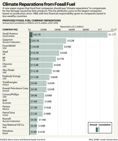 പ്രധാനപ്പെട്ട സ്ഥാപനങ്ങൾ;Saudi Aramco,ExxonMobil,Shell,BP എന്നിവർ പ്രതിവർഷം 20900 കോടി ഡോളർ വെച്ച് 25 വർഷം (2025-50 ) ജനങ്ങൾക്കു നൽകിയാലെ അവർ ഉണ്ടാക്കി വെച്ച നഷ്ടം നികത്താൻ അവസരം ഉണ്ടാകൂ എന്നു പറയുമ്പോൾ, എണ്ണ ഉൽപ്പാദനവും അനുബന്ധ സംവിധാനങ്ങൾ വരുത്തിയ പ്രശ്നങ്ങളുടെ ആഴം ബോധ്യപ്പെടും.