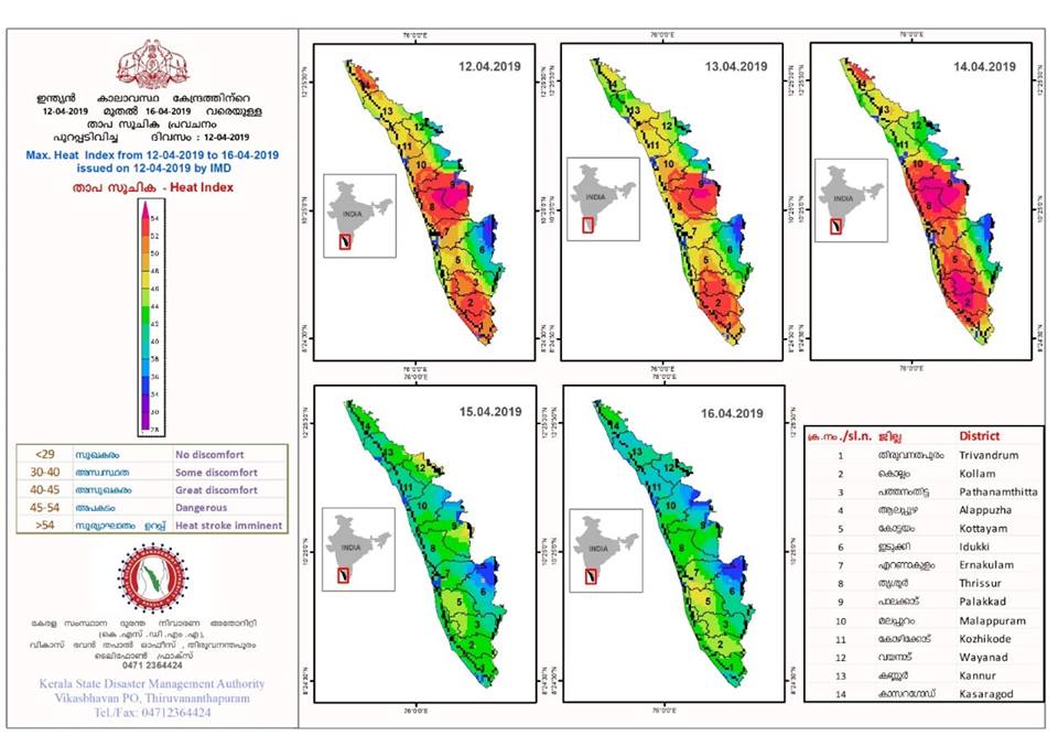 കേന്ദ്ര കാലാവസ്ഥാ വകുപ്പ് പുറപ്പെടുവിച്ച കാലാവസ്ഥാ വിശകലനത്തില് 2019 ഏപ്രില് 12, 13 തീയതികളില് തിരുവനന്തപുരം, കൊല്ലം, ആലപ്പുഴ, പാലക്കാട് എന്നീ ജില്ലകളില് ഉയര്ന്ന താപനില ശരാശരിയില് നിന്നും 2 മുതല് 4 ഡിഗ്രി വരെ ഉയരുവാന് സാധ്യതയുണ്ട് എന്ന് കാണുന്നു.
