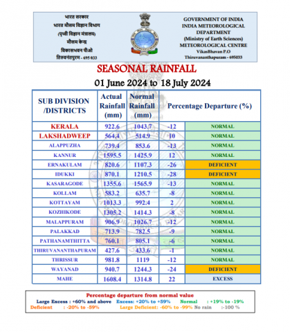 ജൂൺ 1 മുതൽ ജൂലൈ 18 വരെയുള്ള മഴക്കണക്കുകൾ പരിശോധിച്ചാൽ എറണാകുളം ,ഇടുക്കി,വയനാട് ജില്ലകളിൽ 26% മഴ കുറവാണ് കിട്ടിയിരിക്കുന്നത്.ബാക്കി എല്ലാ ജില്ലകളി ലും ശരാശരി മഴയെ ലഭിച്ചിട്ടുള്ളു.1043mm മഴ കിട്ടേണ്ടിടത്ത് 922 mm കിട്ടി(12% കുറവു മഴ).ഒരു ജില്ലകളിലും 60% ത്തിൽ കൂടുതൽ മഴകിട്ടിയിട്ടില്ല.