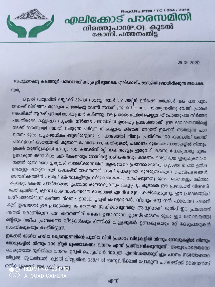 കലഞ്ഞൂരിനെ വിഴുങ്ങുവാൻ തയ്യാറെടുക്കുന്ന ഖനനങ്ങളുടെ പ്രാഥമിക പ്രവർത്തനം നിർത്തിവെക്കണം