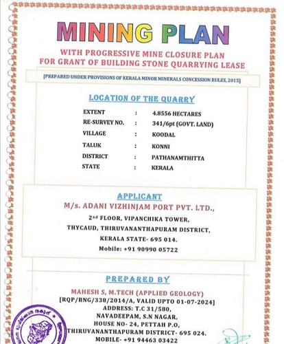 4.85 ഹെക്ടർ ( 20 ഏക്കർ) സർക്കാർ നൽകുന്ന സൗജന്യ ഭൂമിയിലാണ് ഖനനം. 5 വർഷം കൊണ്ട് 13.5578 ലക്ഷം മെട്രിക്ക് sൺ പാറ (ഒരു ലക്ഷം ലോറി പാറ)പൊട്ടിച്ചെടുത്ത് കൊണ്ടു പോകുവാൻ 30.45 ലക്ഷം മെട്രിക്ക് ടൺ ഭാരമുള്ള പാറ കെട്ടുകളാണ് തകർക്കുന്നത്. ശരാശരി 80 മീറ്റർ ആഴമുള്ള ഗർത്തങ്ങൾ ഉണ്ടാക്കി(45 ആൾ താഴ്ച്ച) , വർഷത്തിൽ (300 ദിവസം) പ്രതി ദിനം138 മുതൽ1945 ടൺ വരെ പാറ വിഴിഞ്ഞത്തേക്കു കടത്തും. അതിനായി10 ലോറികൾ (10 to 20 ടൺ)ഉപയോഗിക്കാം.3 Excavetor + 1 Hydraulic Rock Breaker + 1 water Tanker പ്രവർത്തിക്കും. പാറ പൊട്ടിക്കാൻ ഉപയോഗിക്കുന്ന നൈട്രേറ്റ് മിശ്രുതം,Electric Detonator ,Saftey fuse, Non Electric Detenators എന്നിവയെ പറ്റി വിശദമാക്കുന്ന റിപ്പോർട്ട് 42 (!) തൊഴിലാളികൾക്ക് (പഞ്ചായത്തിൽ 500ഓട്ടോ തൊഴിലാളികൾ ഉണ്ട്) തൊഴിൽ നൽകുമെന്നു പറയുന്നു.