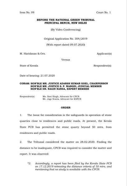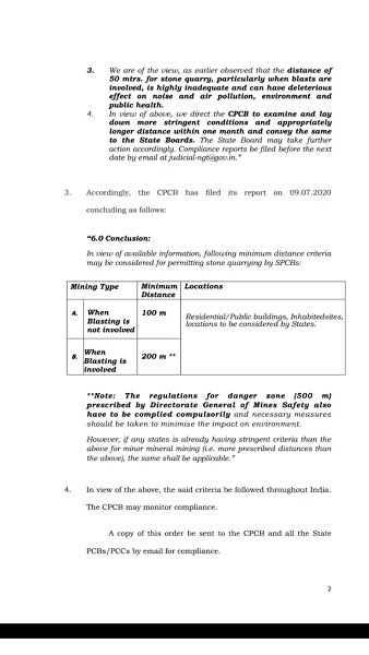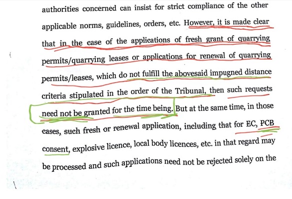 2020 ജൂലൈ 21 ലെ ദേശീയ ഹരിത ട്രൈബ്യൂണൽ വിധിയിൽ കേരളത്തിലെ പാറ ഖനനങ്ങൾ ജനവാസ കേന്ദ്രങ്ങളിൽ നിന്നും റോഡ്, തോട്, ദേവാലയങ്ങൾ, സർക്കാർ കെട്ടിടങ്ങൾ എന്നിവയിൽ നിന്നും 200 മീറ്റർ എങ്കിലും അകലത്തിലും Danger Zone ൽ 500 മീറ്റർ അകലത്തിലുമാകണമെന്ന് തീരുമാനിച്ചു.അതിനെതിരെ ഖനന മുതലാളിമാർ ഹൈക്കോടതിയെ സമീപിച്ചപ്പോൾ നിലവിലുള്ള ഖനനം താൽക്കാലികമായി (സെപ്റ്റംബർ 18 വരെ)തുടരാമെന്നും എന്നാൽ പുതിയ ഖനനത്തിന് 200 മീറ്റർ എങ്കിലും അകലം ഉണ്ടാകണമെന്നും അഭിപ്രായപ്പെട്ടു.