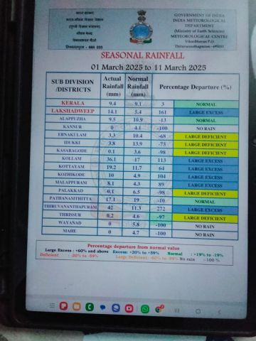 ജനുവരി 1 മുതൽ ഫെബ്രുവരി 28വരെയുള്ള കേരളത്തിൻ്റെ സീസണിൽ ലഭിക്കേണ്ട 21.1mm മഴയിൽ ഇത്തവണ ലഭിച്ചത് 7.2 mm മാത്രമായിരുന്നു.മാർച്ച് 1 മുതൽ 11 വരെ 9.1mm മഴയും കിട്ടി.