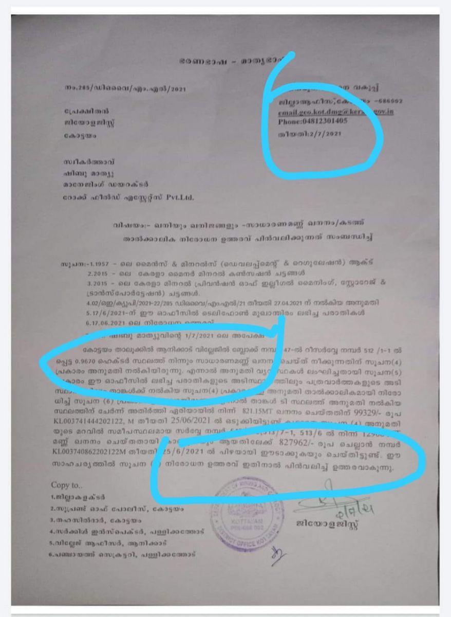 Rock Field Estates Pvt. Ltd. എന്ന കമ്പനിക്ക് 2 ഏക്കറിൽ നിന്നു മാത്രം അതും രണ്ടു മീറ്റർ ആഴത്തിൽ കുഴിക്കുവാൻ കൊടുത്ത അനുവാദത്തിന്റെ മറവിൽ നടന്ന കൈയേറ്റത്തിനെതിരെ ജിയോളജി വകുപ്പ് രണ്ടു പ്രാവശ്യമായി ചുമുത്തിയ പെനാൽറ്റികളിൽ നിന്ന് നിയമലംഘനങ്ങളുടെ വ്യാപ്തി ബോധ്യപ്പെടും.13700 മെ. ടൺ മണ്ണ് അനധികൃതമായി കടത്തിയതിന് 10 ലക്ഷം രൂപയോളം പിഴ അടച്ച സംഭവം വലിയ തോതിലുള്ള പ്രകൃതി ചൂഷണത്തിന്റെ വ്യാപ്തിബോധ്യപെടും.
