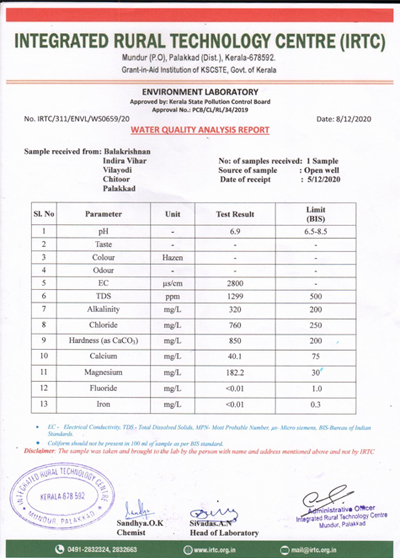 ടോട്ടൽ ഡിസ്റ്റോൾവ്ഡ് സോളിഡ്സ് ക്ലോറൈഡുകൾ, ഹാർഡ്നസ് , മംഗ്നീഷ്യം തുടങ്ങിയ അനുവദനീയമായതിലും എത്രയോ കൂടുതലാണ് അടങ്ങിയിരിക്കുന്നത്. ഇത് എത്തരത്തിലാണ് മനുഷ്യരുടെ ആരോഗ്യത്തെ ബാധിക്കുന്നതെന്ന് സർക്കാർ ഏജൻസികൾ പഠിക്കണം. ഗുരുതരമായ ആരോഗ്യപ്രശ്നങ്ങളുണ്ടാക്കുന്നുണ്ടെങ്കിൽ അത് ശുദ്ധീകരിച്ച് വിതരണം ചെയ്യാനുള്ള പദ്ധതികൾ ഉടൻ ആസൂത്രണം ചെയ്യുകയും വേണം.