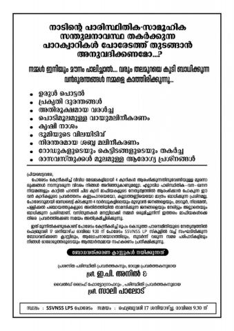 ക്വാറികൾ ഉണ്ടാക്കുന്ന ആഘാതങ്ങളെ പറ്റി നാളെ,ഫെബ്രു വരി 17, ബോധവത്കരണ ക്ലാസുകൾ സംഘടിപ്പിക്കുന്നു. രാവിലെ 9.30 മണി മുതൽ ശ്രീ. സാലി പാലോട്, E p അനിൽ എന്നിവർ പങ്കെടുക്കും