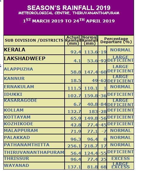 (അധിവൃഷ്ടി ശരാശരി + 20% അതിനു മുകളിലും , സാധാരണ മഴ (ശരാശരി +19 or - 19% കുറവ് മഴ ശരാശരി - 20 to - 99%) ബംഗാൾ ഉൾക്കടലിലെ ചുഴലിക്കാറ്റ് (ഫോനി) കൊടുംകാറ്റായി കേരള തീരത്ത് എത്തുന്നില്ല എങ്കിലും സംസ്ഥാനത്ത് വേണമെങ്കിൽ ഉണ്ടാക്കുവാൻ കഴിയുന്ന തിരിച്ചടികൾ വളരെ വലുതാണ്.