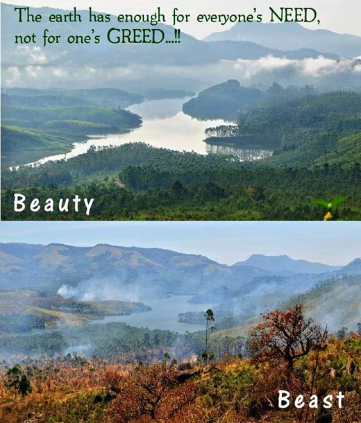 ഭൂമി ഈ ഒരു തലമുറയ്ക്ക് മാത്രമുള്ളതല്ല. ഇതിനുമുന്പും പതിനായിരകണക്കിന് തലമുറകൾ ഉണ്ടായിരുന്നു ഇനിയും പതിനായിരക്കണക്കിന് തലമുറകൾ കടന്നു വരാനുമുണ്ട്. സൂക്ഷ്മാണുക്കൾ മുതൽ നീലത്തിമിംഗലം വരെയുള്ള ലക്ഷകണക്കിന് ജന്തുക്കളും കോടിക്കണക്കിനു സസ്യജാലങ്ങളും അടങ്ങുന്ന ജൈവ വൈവിധ്യ കലവറയാണ് നാം അധിവസിക്കുന്ന ഭൂമി. ഇവയെല്ലാം കൂടിയുള്ള ഒരു സന്തുലിത അവസ്ഥയിലാണ് ഭൂമിയുടെ നിലനിൽപ്പു. എവിടെയെങ്കിലും അസന്തുലിതാ അവസ്ഥ സംഭവിച്ചാൽ പ്രകൃതി ഇടപെടുകതന്നെ ചെയ്യും. ലാത്തൂരിലെ ഭൂകമ്പം, ഉത്തരാഖണ്ഡിലെ മേഘവിസ്പോടനത്തിനെ തുടർന്നുണ്ടായ വെള്ളപ്പൊക്കവും, ലോകത്തിൽ പല രാജ്യത്തിലെയും ലക്ഷകണക്കിനു മനുഷ്യരെ തുടച്ചു നീക്കിയ സുനാമിയുടെയും, വെള്ളപോക്കങ്ങളുടെയും, ചുഴലിക്കാറ്റുകളുടെയും രൂപത്തിൽ പ്രകൃതി സൂചികരണ പ്രവർത്തനങ്ങൾ നടത്തികൊണ്ടേയിരിക്കുന്നു. 2018 ൽ കേരളത്തിൽ മലവെള്ളം കുത്തിയൊലിച്ചുവന്നപ്പോൾ പുഴയോഴുകേണ്ട വഴികൾ അടച്ചു നമ്മൾ കെട്ടിപ്പൊക്കിയ മണിമാളികകൾ സംരക്ഷികാനായി അവക്ക് ചുറ്റിലും നമ്മൾ അയൽവാസികൾ കയറാതെ കെട്ടിപൊക്കിവച്ച മതില്കെട്ടുകൾക്കു ഒന്നും ചെയ്യുവാൻ കഴിഞ്ഞിരുന്നില്ല . ജലം സംരക്ഷിച്ചു സംഭരിക്കേണ്ട വയലേലകൾ നികത്തി അംബരചുംബികളായ മണിമാളികൾ പണിഞ്ഞു വച്ചിട്ട് മഴപെയ്തു വന്ന വെള്ളത്തെ പേടിച്ചു അതിന്റെ മുകളിലത്തെ നിലയിൽ നിന്ന് ഒരുനേരത്തെ അന്നത്തിനുവേണ്ടി നിലവിളിച്ച ജനങ്ങളെയും നമ്മൾ കണ്ടതാണ് .എന്നിട്ടും നമ്മൾ എന്താണ് പഠിച്ചത്. 2018 വന്ന വെള്ളപൊക്കം ഇനി നൂറു വര്ഷത്തെ കഴിനെ പണ്ടത്തെപ്പോലെ ഇനിയും വരുകയുള്ളു എന്ന് നാം പ്രതീക്ഷിച്ചു. വെള്ളം ഇറങ്ങിക്കഴിഞ്ഞപ്പോൾ വീണ്ടും വെട്ടിപിടിക്കുവാനും തീരദേശവും മലകളും കുന്നുകളും കയ്യേറുവാനും നമ്മൾ ഇറങ്ങി തിരിച്ചു. അടുത്ത വര്ഷം അതിലുംഭീകരമായി വെള്ളപൊക്കം ഉണ്ടായപ്പോഴും, തീരദേശത്താകെ കൊടുങ്കാറ്റു വീശിയടച്ചപ്പോഴും നിസഹായരായി നോക്കിനിൽക്കാനേ നമുക്ക് കഴിഞ്ഞൊള്ളു.